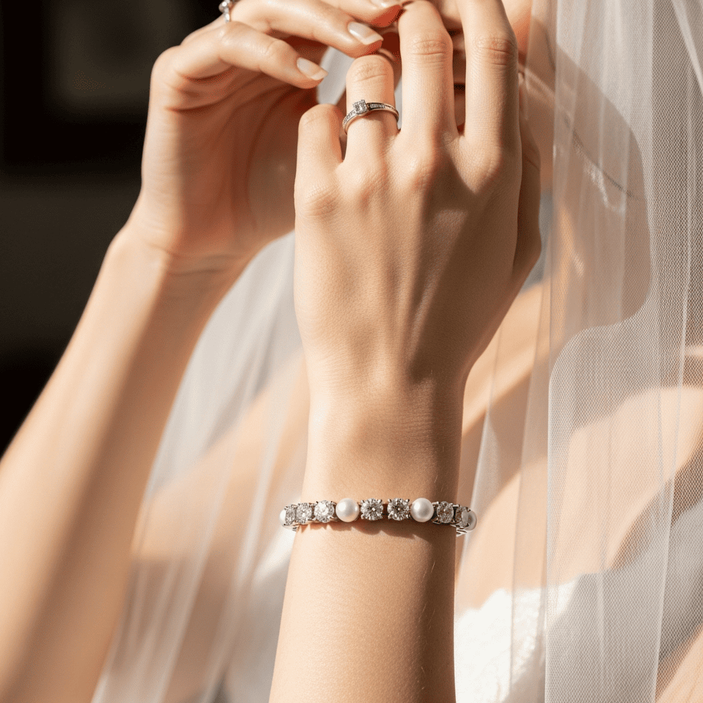 Classic tennis bracelet style. Alternating brilliant-cut diamonds and small white South Sea Pearls, set in 18k White Gold flower cup settings.