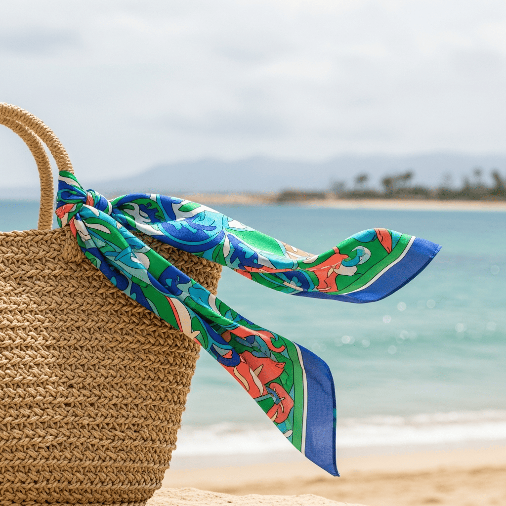 A silk-cotton blend scarf. The print combines traditional Lombok Batik wax patterns with Breton anchors and hydrangeas in a teal and indigo palette.