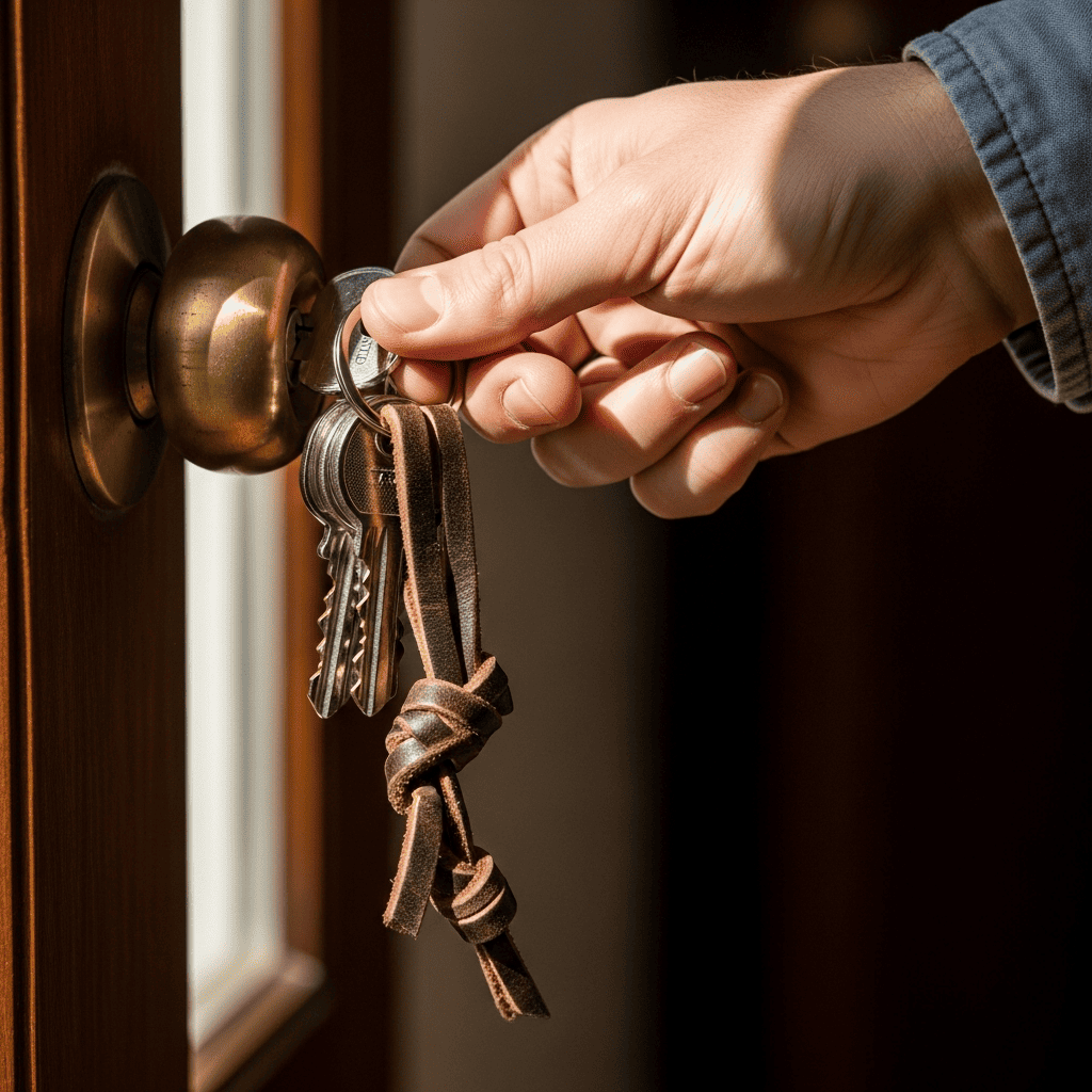 A keychain made of thick monkey-fist knot work (Breton sailor style) using leather, with a mother-of-pearl tag engraved with the brand logo.